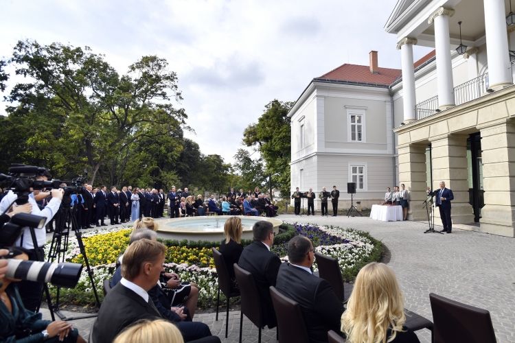 Kovács Zoltán, az Egy a természettel Vadászati és Természeti Világkiállítás lebonyolításáért felelős kormánybiztos, nemzetközi kommunikációért és kapcsolatokért felelős államtitkár beszédet mond a felújított Bodajki Vadászkastély, a hozzá kapcsolódó kiállítás és élményközpont átadóünnepségén 2021. szeptember 18-án (Fotó: MTI / Máthé Zoltán)