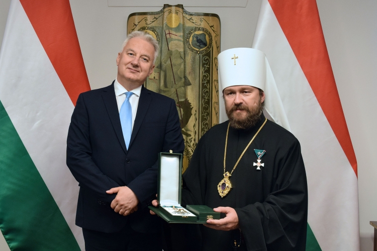 Semjén Zsolt (KDNP), miniszterelnök-helyettes átadja a Magyar Érdemrend középkeresztje a csillaggal kitüntetést Hilarion metropolitának, az Orosz Ortodox Egyház külügyi vezetőjének (Budapest, 2019.09.06. KDNP fotó: Váli Miklós)