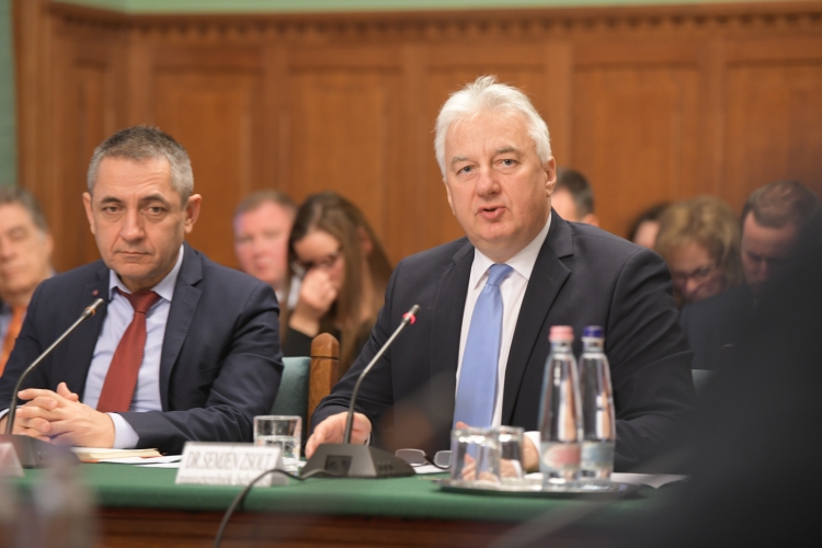 Potápi Árpád János, nemzetpolitikáért felelős államtitkár (b) és Semjén Zsolt nemzetpolitikáért, egyházügyekért és nemzetiségekért felelős miniszterelnök-helyettes (j) az Országgyűlés nemzeti összetartozás bizottsága előtti meghallgatáson (Budapest, 2019.12.09. Fotó: KDNP)