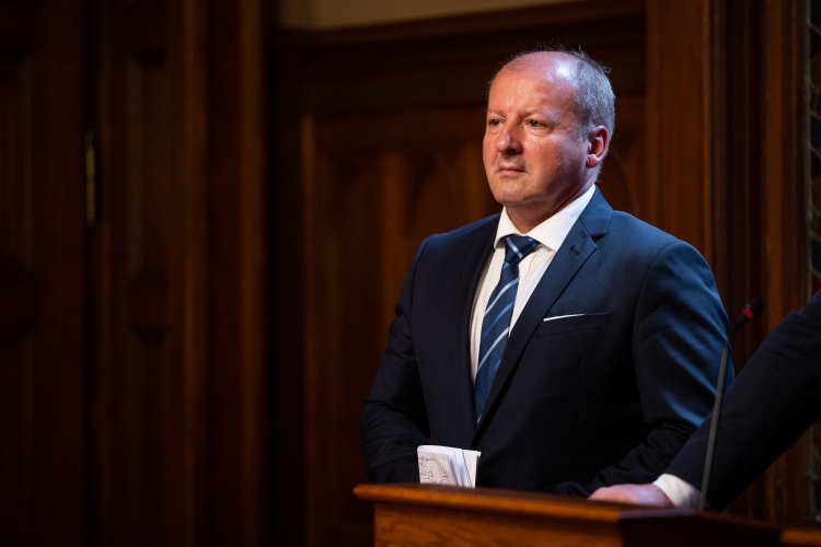 Simicskó István, a Kereszténydemokrata Néppárt parlamenti frakcióvezetője a 2021. évi költségvetés elfogadását követően tartott sajtótájékoztatón az Országházban 2002. június 3-án. (KDNP fotó)