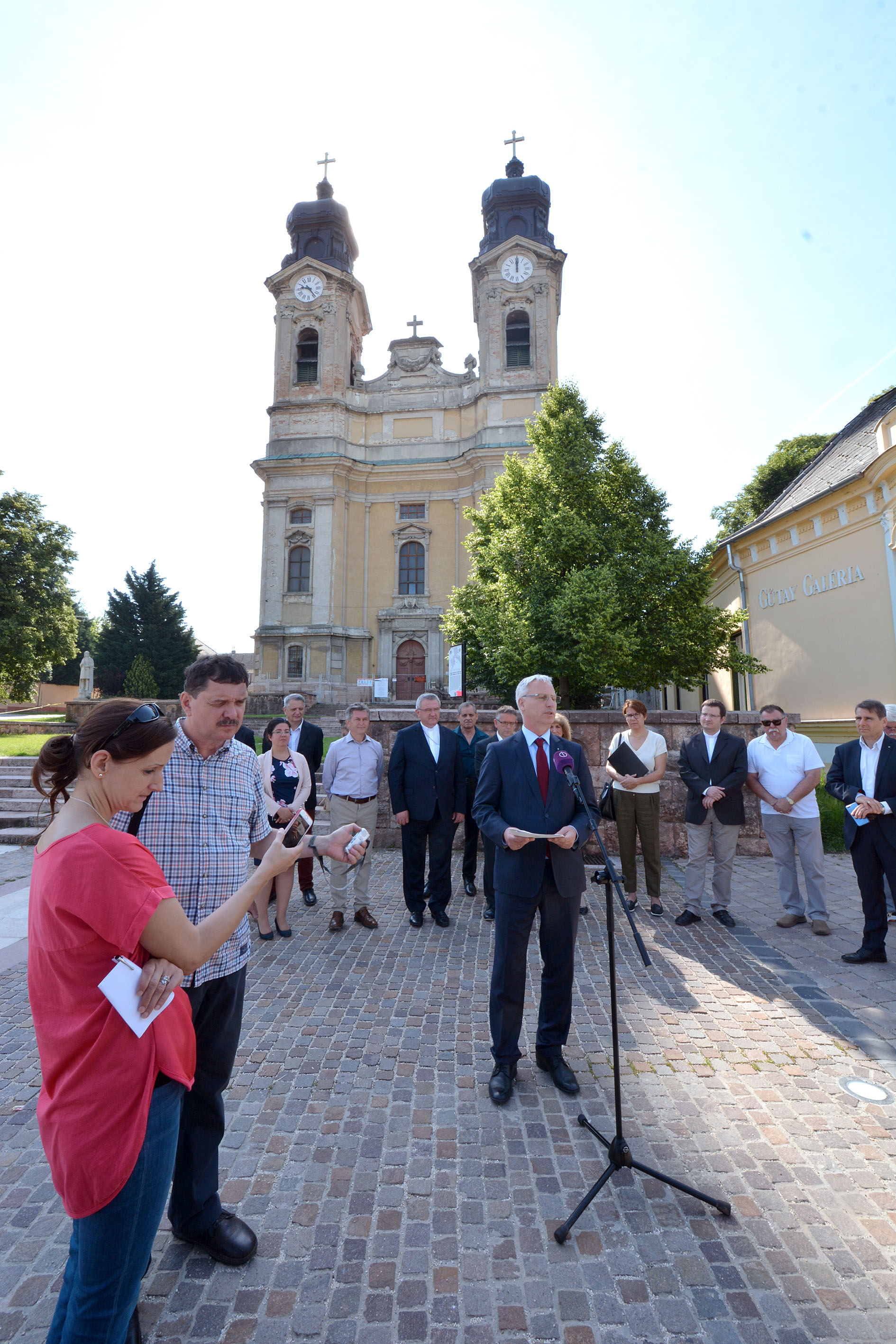 Michl József (KDNP), Tata polgármestere elmondta, hogy a belvárosban álló Szent Kereszt felmagasztalása templom az esztergomi bazilika után Komárom-Esztergom megye második legnagyobb temploma. A város nagy jelentőségű, copf és késő barokk stílusú műemléke, a főhajót közrefogó tornyok csaknem 60 méter magasak.