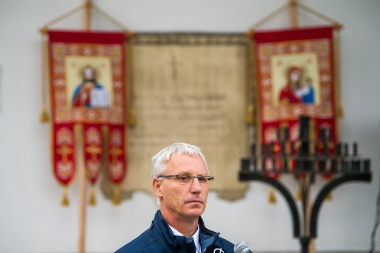 Soltész Miklós (KDNP), a Miniszterelnökség egyházi és nemzetiségi kapcsolatokért felelős államtitkára beszédet mond a felújított Szent Cirill és Szent Metód bolgár ortodox templom és templomkert átadásán a főváros IX. kerületében a magyar-bolgár barátság napján, 2020. október 19-én. (MTI fotó: Balogh Zoltán)