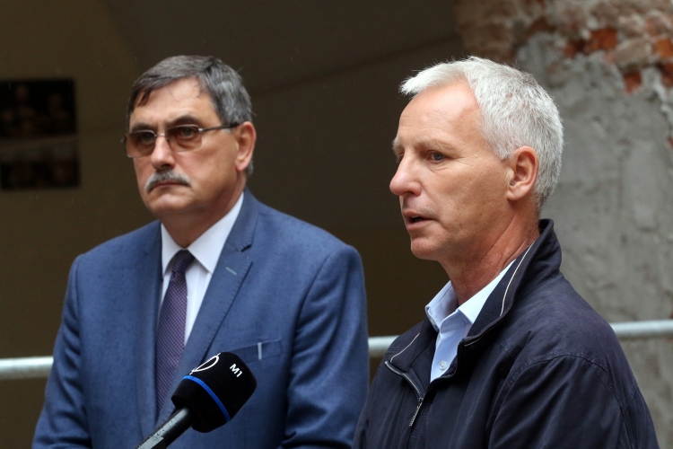 Soltész Miklós, a Miniszterelnökség egyházi és nemzetiségi kapcsolatokért felelős államtitkára (j) és Hörcsik Richárd, a Fidesz országgyűlési képviselője sajtótájékoztatót tart a megújuló és bővülő piarista kollégiumban Sátoraljaújhelyen 2020. július 27-én. (MTI fotó: Vajda János)