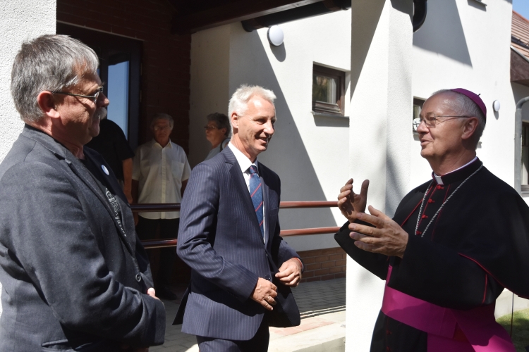 Ternyák Csaba, a fenntartó Egri Főegyházmegye érseke (k) megáldja az új óvodát és használóit a Szent Kristóf Katolikus Óvoda átadóünnepségén Törökszentmiklóson 2020. augusztus 30-án. Jobbról Soltész Miklós, a Miniszterelnökség egyházi és nemzetiségi kapcsolatokért felelős államtitkára (j5), Markót Imre polgármester (j4) és Rudolf Mihály tervező (b). (MTI fotó: Mészáros János)