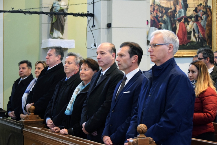 Soltész Miklós, a Miniszterelnökség egyházi és nemzetiségi kapcsolatokért felelős államtitkára, Szaniszló Sándor, a XVIII. kerület polgármestere és Somody László Zoltán alpolgármester (j-b) ünnepi szentmisén a Budapesti Szent Imre templomban 2020. február 23-án. (KDNP: Váli Miklós)