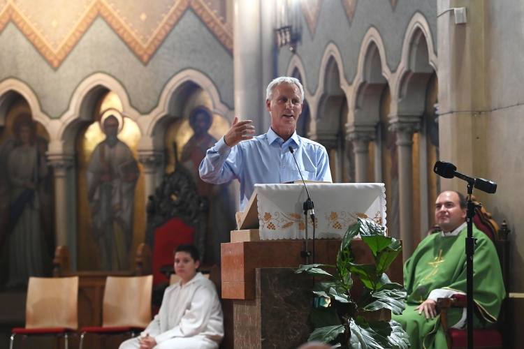 Soltész Miklós (KDNP), a Miniszterelnökség egyházi és nemzetiségi kapcsolatokért felelős államtitkára beszél az Újlipótvárosi Szent Margit Plébániatemplomban tartott gitáros ifjúsági szentmise végén 2020. augusztus 16-án. Mögötte Monostori László esperes, plébániai kormányzó (j). (MTI fotó: Bruzák Noémi)