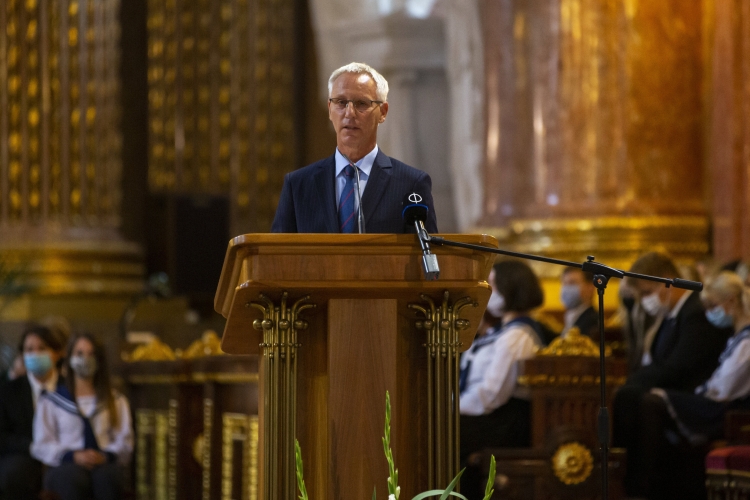 Soltész Miklós (KDNP), a Miniszterelnökség egyházi és nemzetiségi kapcsolatokért felelős államtitkára beszédet mond a szombathelyi Premontrei Rendi Szent Norbert Gimnázium ünnepélyes tanévnyitóján a szombathelyi Sarlós Boldogasszony-székesegyházban 2020. augusztus 31-én. (MTI fotó: Varga György)