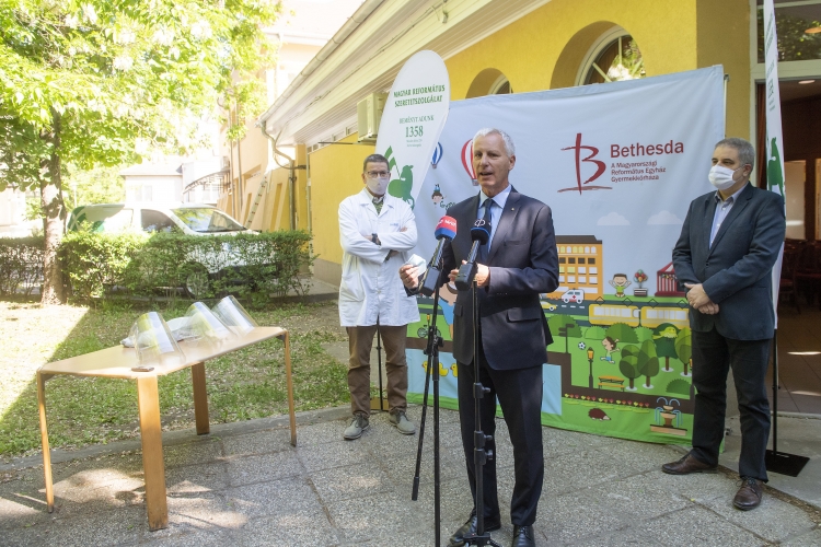 Soltész Miklós, a Miniszterelnökség egyházi és nemzetiségi kapcsolatokért felelős államtitkára, a Nemzeti Humanitárius Koordinációs Tanács elnöke a Bethesda Gyermekkórház udvarán tartott sajtótájékoztatón 2020. május 7-én. A Magyar Református Szeretetszolgálat tízezer arcvédő pajzsot adományoz kórházaknak, diakóniai és határon túli intézményeknek. Balról Velkey György, a Bethesda Gyermekkórház főigazgatója, jobbról Beszterczey András, a Magyarországi Református Egyház Diakóniai Iroda vezetője. (MTI fotó: Illyés Tibor)