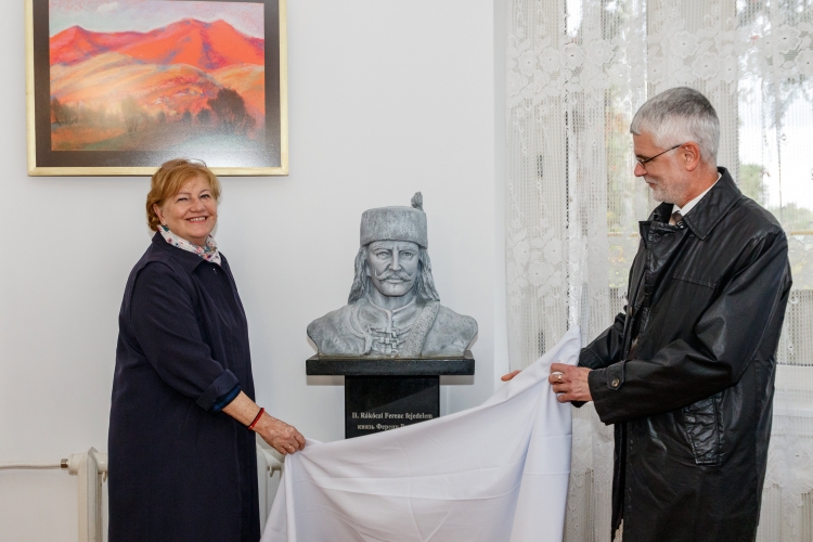 Ungvár, 2023. október 26. Szili Katalin miniszterelnöki főtanácsadó (b) és Vida László első beosztott konzul felavatja II. Rákóczi Ferenc mellszobrát az Ungvári Nemzeti Egyetem Hungarológiai Központja létrejöttének 35. évfordulója alkalmából rendezett ünnepségen 2023. október 26-án. MTI/Nemes János