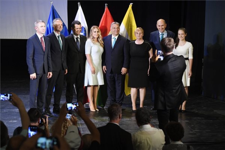 Orbán Viktor miniszterelnök (j4), Janez Jansa, a Szlovén Demokrata Párt (SDS) elnöke (j2) és Magyar Janez, a Szlovén Demokrata Pár (SDS) muravidéki jelöltje (b3) az SDS kampányrendezvényén Lendván, a kulturális központban 2018. május 11-én. MTI Fotó: Koszticsák Szilárd