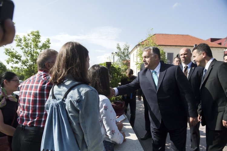 Orbán Viktor miniszterelnököt helyiek köszöntik a szlovéniai Lendván a kulturális központ előtt 2018. május 11-én. Mellette Magyar Janez, a Szlovén Demokrata Pár (SDS) muravidéki jelöltje (j). Szlovéniában június 3-án előrehozott parlamenti választásokat tartanak. MTI Fotó: Koszticsák Szilárd