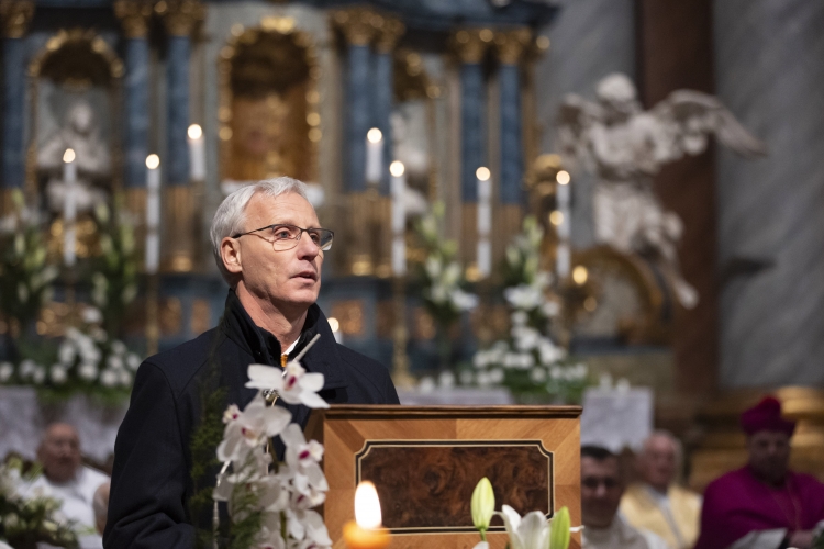Soltész Miklós, a Miniszterelnökség egyházi és nemzetiségi kapcsolatokért felelős államtitkára, a KDNP országgyűlési képviselője beszédet mond a megújult szentgotthárdi Nagyboldogasszony-plébániatemplom ünnepi szentmiséjén 2022. március 16-án. Az 1779-ben épült, barokk stílusú ciszterci templom több mint 720 millió forintos ráfordítással, 535 millió forintos kormányzati támogatással újult meg. Fotó: MTI/Varga György