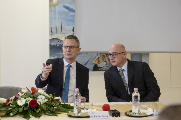 Rétvári Bence, a Belügyminisztérium parlamenti államtitkára, a KDNP politikusa és Boczek Tibor főigazgató a pásztói Margit Kórház orvos-nővérszállójának átadásán 2023. február 20-án. MTI/Komka Péter