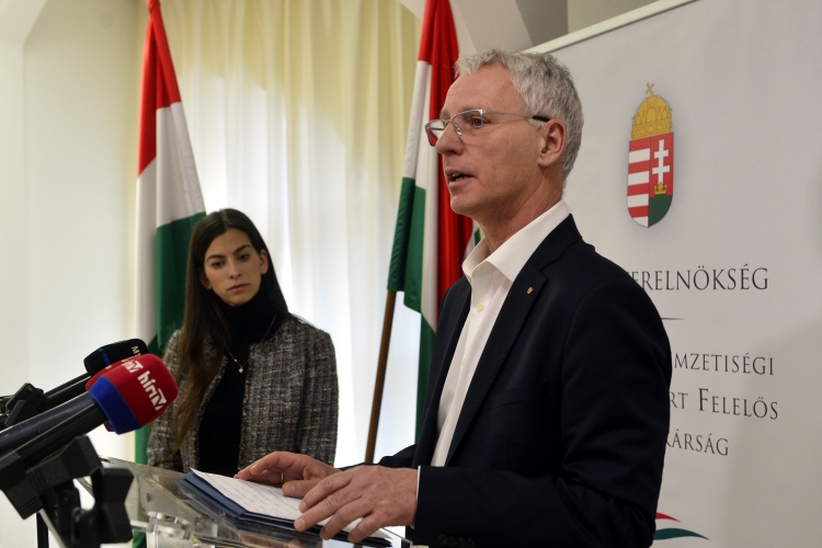 Soltész Miklós, a Miniszterelnökség egyházi és nemzetiségi kapcsolatokért felelős államtitkára, a NHKT elnöke és Szentkirályi Alexandra kormányszóvivő a Nemzeti Humanitárius Koordinációs Tanács (NHKT) ülése után tartott sajtótájékoztatón a Miniszterelnökségen 2022. február 28-án. Elérte a 65 millió forintot a kormány által indított Híd Kárpátaljáért segélyprogramon keresztül felajánlott adományok összege (Fotó: MTI / Kovács Attila)