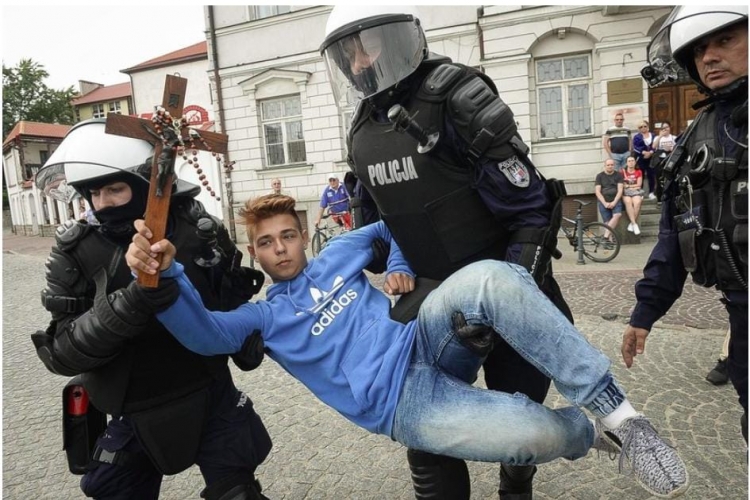 Hazánkban véget ért, Lengyelországban viszont még csak most kezdődik a Pride-hónap, melynek részeként Płock városában is szivárványos karnevált rendeztek a helyi homoszexuálisok – írja a Pesti Srácok. A mutatvány azonban nem aratott osztatlan sikert: egy 15 éves fiú, Jakub Baryla egy kereszttel a kezében állt ki a vonuló tömeg elé, mivel, mint mondta, a menet résztvevői megsértették katolikus hitét azzal, hogy szivárványos jelképeikkel meggyalázzák a szakrális jelképeket és a lengyel zászlót. Természetesen egy jogvédő sem kelt Jakub segítségére, helyette a rendőrök vitték el a helyszínről.