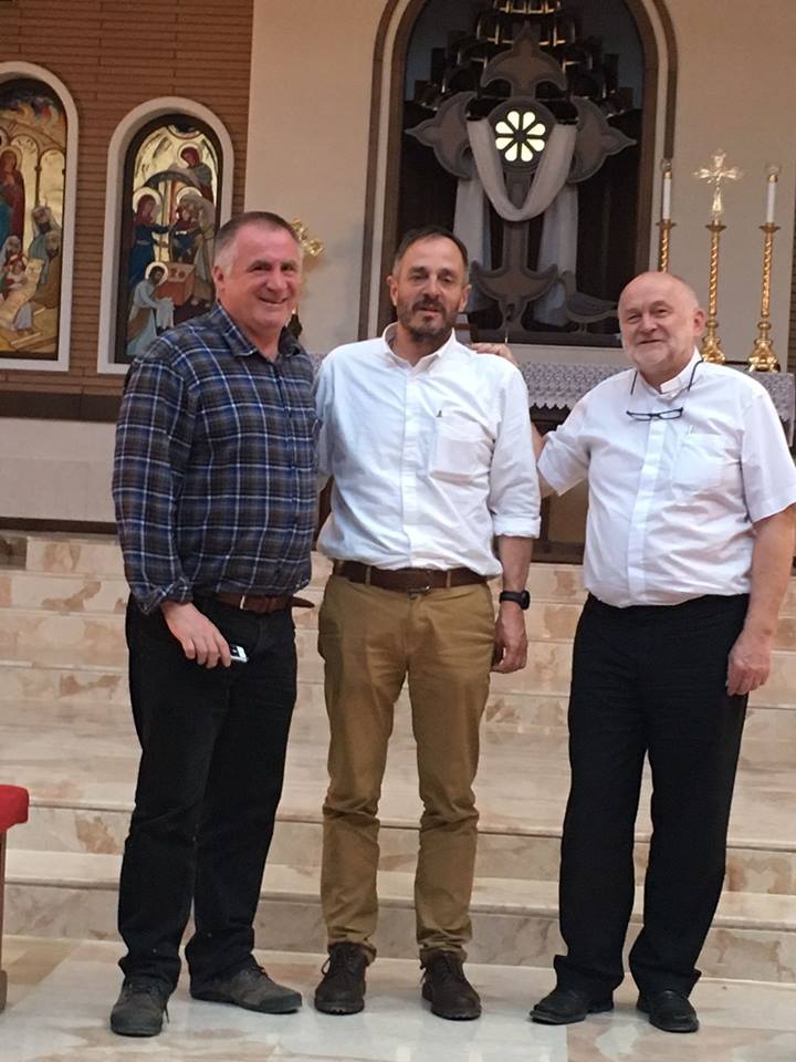 Böjte Csaba ferences szerzetes, Hölvényi György kereszténydemokrata európai parlamenti képviselő és Sajgó Szabolcs jezsuita szerzetes a Szent József Székesegyházban, az észak-iraki Erbilben.