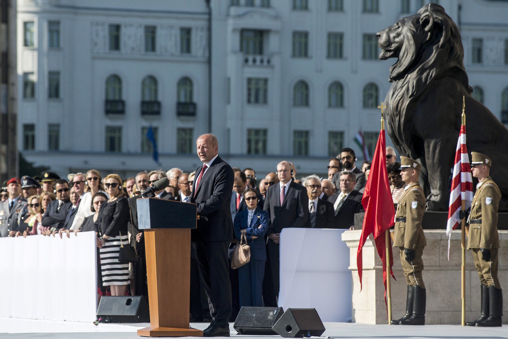 Simicskó István honvédelmi miniszter köszöntőt mond a Nemzeti Közszolgálati Egyetem újonnan végzett honvédtisztjelöltjei eskütételén az augusztus 20-i nemzeti ünnepen a budapesti Kossuth téren 2016. augusztus 20-án. (MTI Fotó: Marjai János)