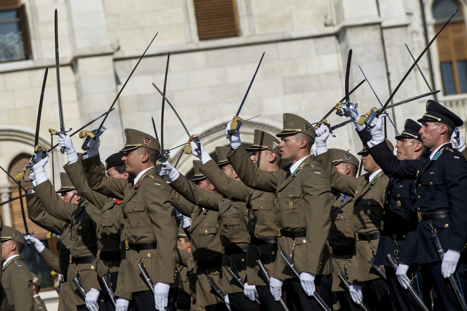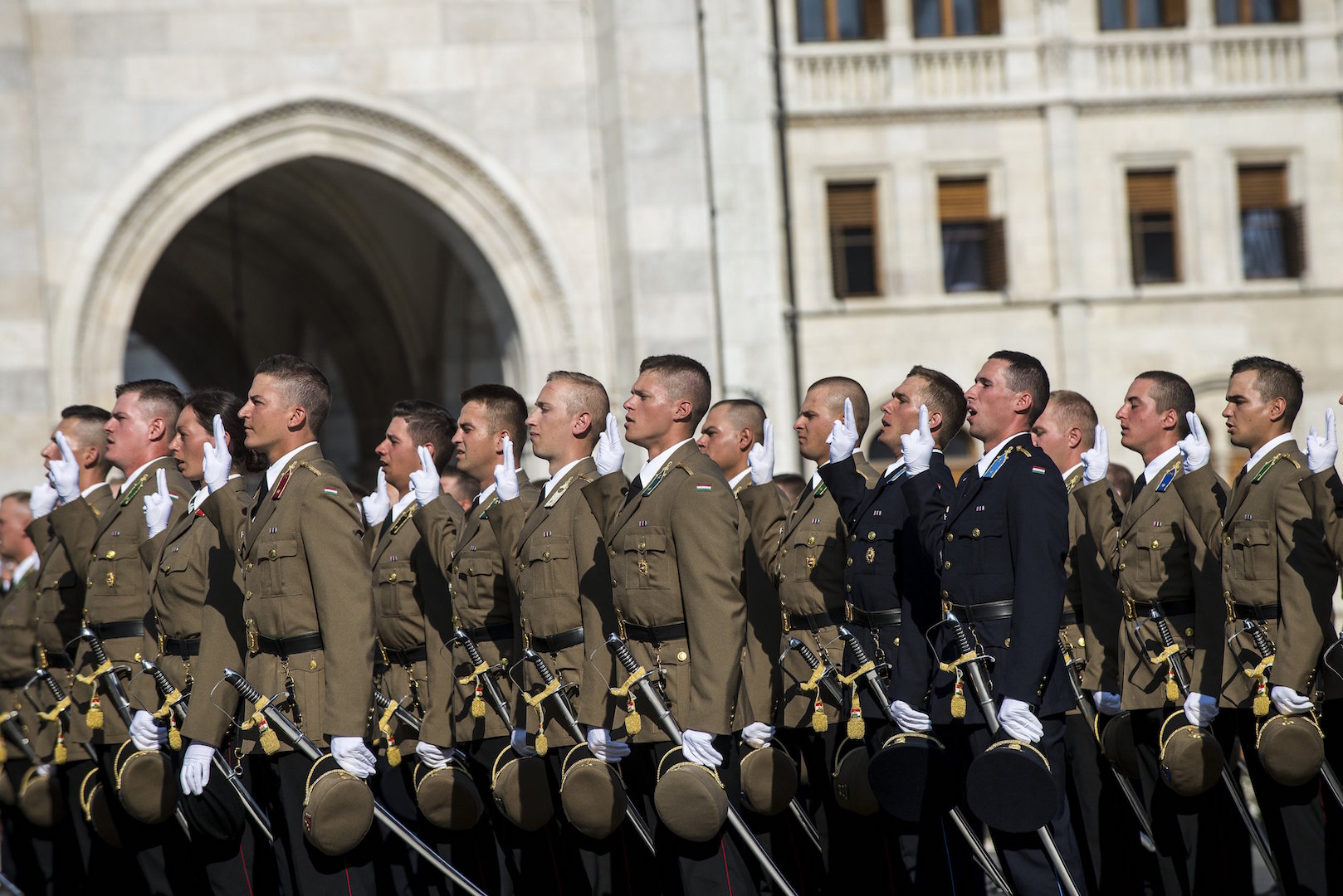 A Nemzeti Közszolgálati Egyetem újonnan végzett honvédtisztjelöltjei eskütétele az augusztus 20-i nemzeti ünnepen a budapesti Kossuth téren 2016. augusztus 20-án. (MTI Fotó: Marjai János)