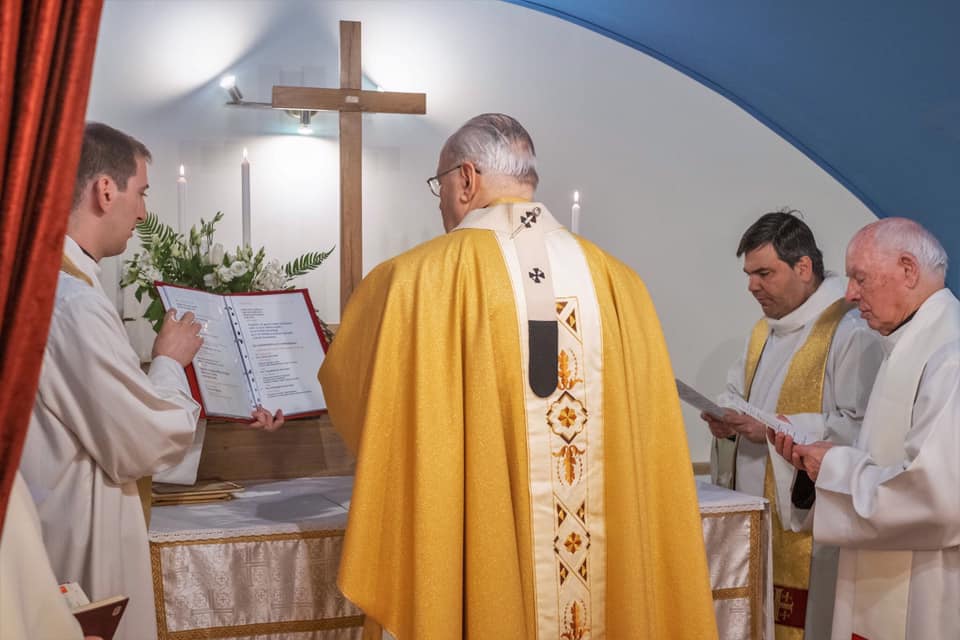Erdő Péter bíboros (b2) felszenteli a Szent István első vértanúról nevezett kápolnát (Budapest, 2020.03.07. Fotó: Azbej Tristan Facebook oldala)