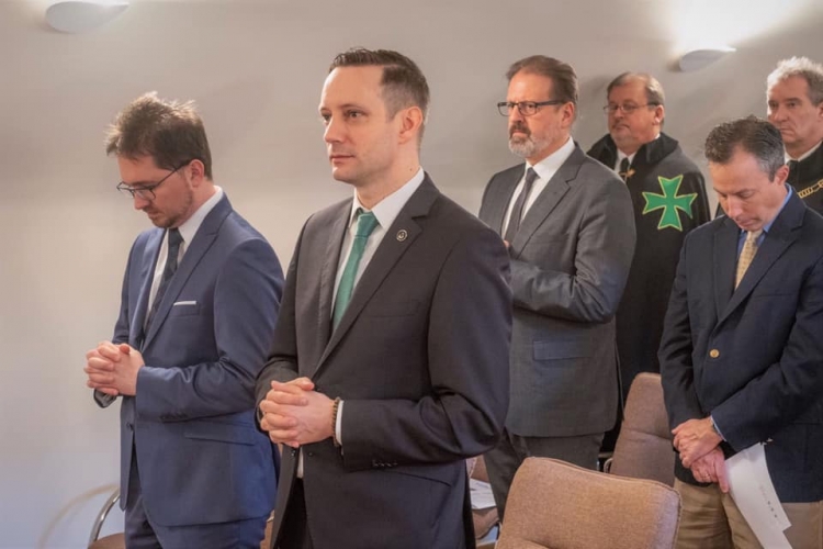 Azbej Tristan (KDNP), a Miniszterelnökség üldözött keresztények megsegítéséért és a Hungary Helps Program megvalósításáért felelős államtitkára (b2) az államtitkárság épületében lévő, Szent István első vértanúról nevezett kápolna felszentelésén (Budapest, 2020.03.07. Fotó: Azbej Tristan Facebook oldala)