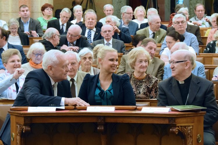 Harrach Péter, a KDNP frakcióvezetője, a Magyar Kereszténydemokrata Szövetség elnöke (balra), Juhász Hajnalka miniszteri biztos, kereszténydemokrata országgyűlési képviselő és Márfi Gyula veszprémi katolikus érsek a keresztény Európáról és Magyarországról szóló konferencián az Országházban 2019. május 9-én (KDNP fotó: Váli Miklós)