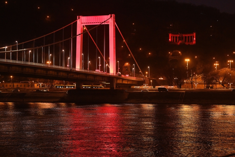 Budapest, 2020. november 25. A vörös színnel megvilágított Erzsébet híd 2020. november 25-én. A Red Wednesday (vörös szerda) kezdeményezéshez csatlakozva ezen a napon vörös fénnyel festettek meg több budapesti épületet, hogy felhívják a figyelmet az üldözött, illetve vértanúságot szenvedett keresztényekre. (Fotó: MTI / Bruzák Noémi)