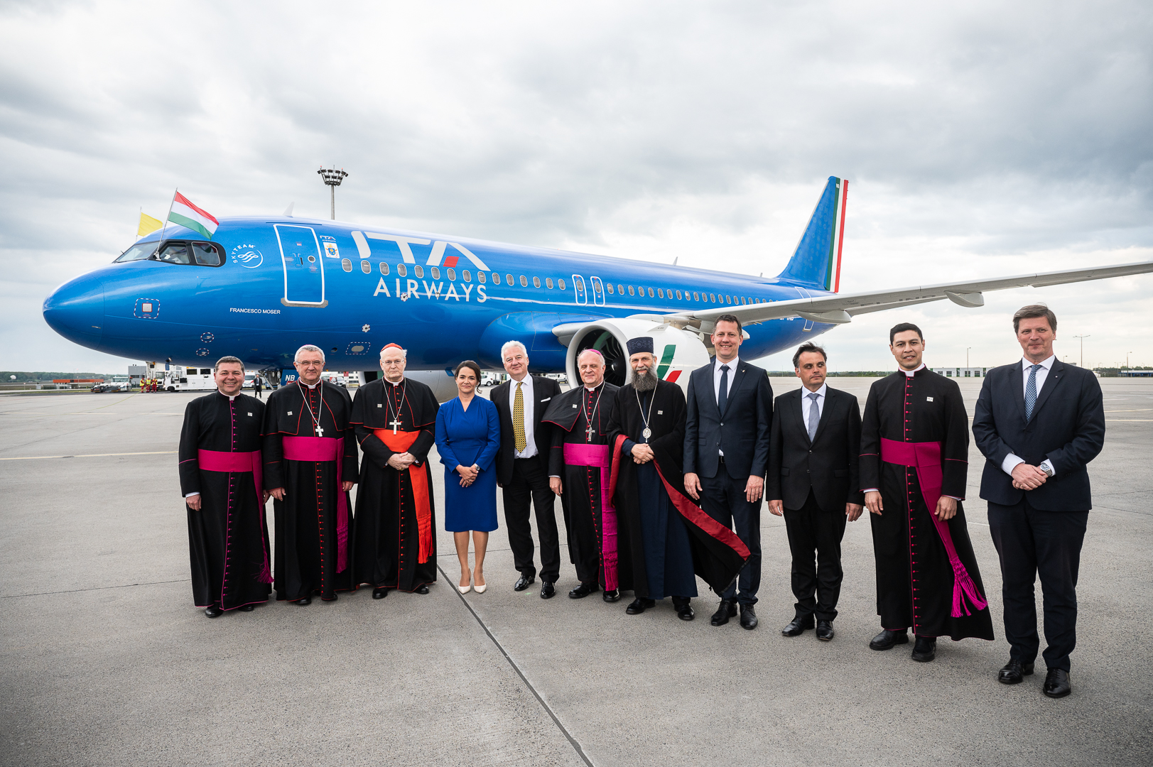 A kifutópályán guruló repülőgép pilótafülkéjének ablakába – az egyházfő érkezéséhez hasonlóan – a felszállásig vatikáni és magyar zászlót helyeztek ki.