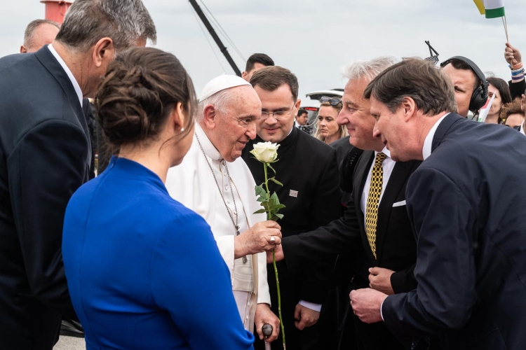 Apostoli látogatásának első napján, pénteken Ferenc pápát Novák Katalin köztársasági elnök fogadta a Sándor-palota előtti téren. A ceremónia után az egyházfő udvariassági látogatást tett a Sándor-palotában az államfőnél, majd találkozott Orbán Viktor miniszterelnökkel. Ezt követően a Karmelita kolostorban állami hatóságok, a társadalmi élet és a diplomáciai testület képviselőinek részvételével tartottak rendezvényt. Az eseményen beszédet mondott Ferenc pápa és Novák Katalin köztársasági elnök.
