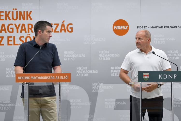 Kocsis Máté (balra), a Fidesz és Simicskó István, a KDNP képviselőcsoportjának vezetője a frakciószövetség kihelyezett üléséről tartott sajtótájékoztatón Debrecenben 2021. június 17-én (Fotók: MTI / Czeglédi Zsolt)