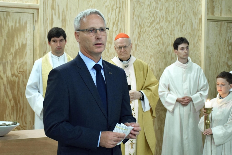 Soltész Miklós, a Miniszterelnökség államtitkára, a KDNP alelnöke és Erdő Péter bíboros, esztergom-budapesti érsek a Budapesti Katolikus Egyetemi és Főiskolai Lelkészség új közösségi termének avatóján a Felső-Lágymányosi Magyar Szentek Plébániatemplom szomszédságában.