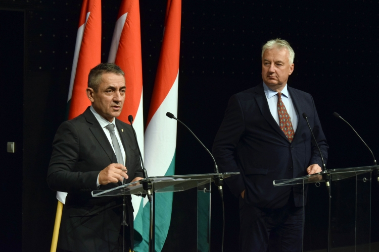 Semjén Zsolt nemzetpolitikáért felelős miniszterelnök-helyettes (j) és Potápi Árpád János nemzetpolitikáért felelős államtitkár sajtótájékoztatót tart a Magyar Állandó Értekezlet végén a fővárosi Várkert Bazárban 2019. november 15-én. (KDNP fotó: Váli Miklós)