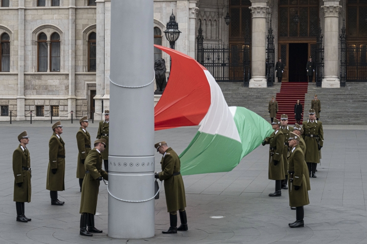 Katonai tiszteletadás mellett, Novák Katalin köztársasági elnök és Ruszin-Szendi Romulusz, a Magyar Honvédség parancsnoka jelenlétében ünnepélyesen felvonták, majd félárbócra engedték a nemzeti lobogót a nemzeti gyásznapon, az 1956-os forradalom és szabadságharc leverésének, a szovjet csapatok bevonulásának évfordulóján pénteken az Országház előtti Kossuth Lajos téren.
