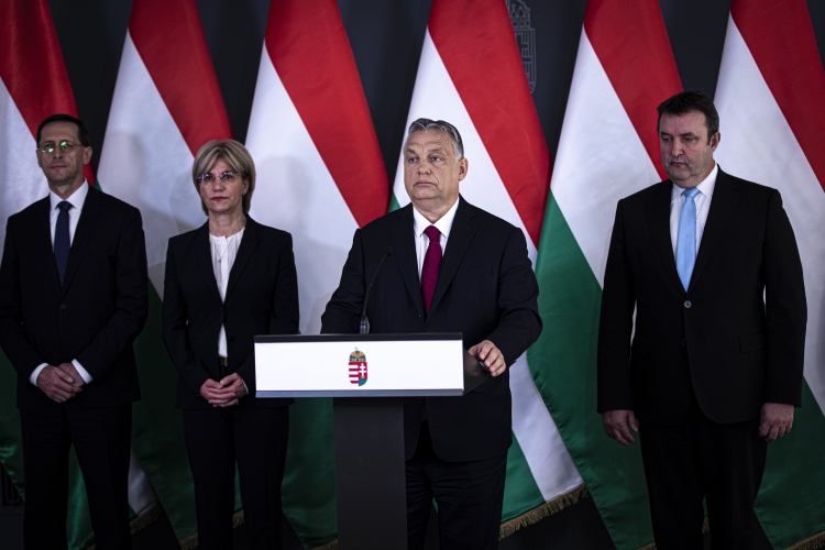 A Miniszterelnöki Sajtóiroda által közreadott képen Orbán Viktor miniszterelnök bejelentést tesz Budapesten 2020. április 6-án. A kormányfő mögött Varga Mihály pénzügyminiszter, Mager Andrea nemzeti vagyon kezeléséért felelős miniszter és Palkovics László innovációs és technológiai miniszter (b-j). (Budapest, 2020.04.06. Fotó: MTI, Miniszterelnöki Sajtóiroda, Fischer Zoltán)