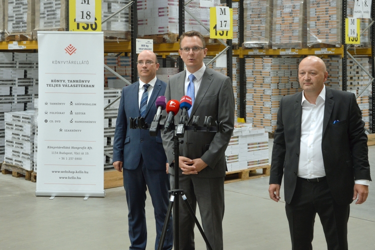 Rétvári Bence (KDNP), az Emberi Erőforrások Minisztériumának parlamenti államtitkára (k) a Könyvtárellátó Nonprofit Kft. (Kello) raktárában tartott sajtótájékoztatón Maruzsa Zoltánnal, az Emmi köznevelésért felelős helyettes államtitkárával (b) és Tőczik Zsolttal, a Könyvtárellátó Nonprofit Kft. ügyvezetőjével (j) (Budapest, 2019.08.01.)