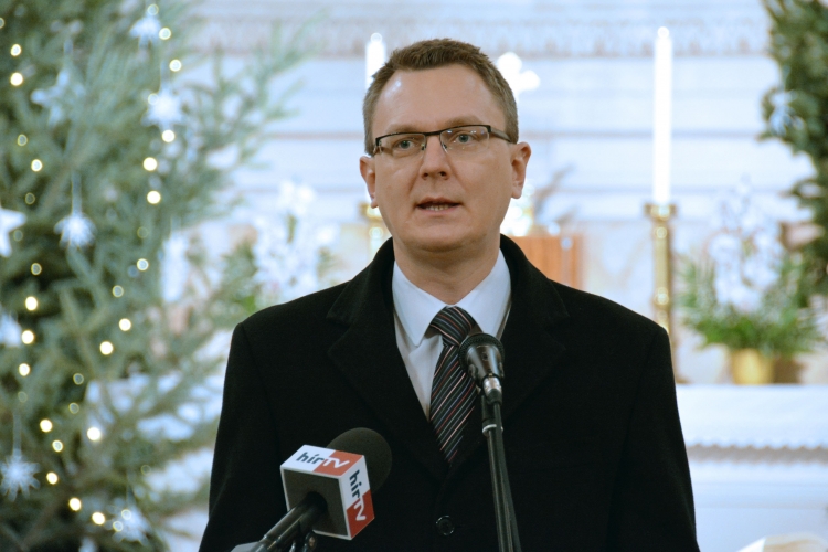Rétvári Bence (KDNP), az Emberi Erőforrások Minisztériumának (Emmi) parlamenti államtitkára beszédet mond a málenkij robotra elhurcolt áldozatok tiszteletére tartott megemlékezésen a nagymarosi római katolikus templomban 2019. január 13-án. (KDNP fotó: Váli Miklós)