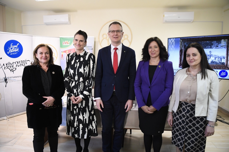 Rétvári Bence, a Belügyminisztérium parlamenti államtitkára (középen), Nagy-Vargha Zsófia, a Kulturális és Innovációs Minisztérium fiatalokért felelős helyettes államtitkára (balról a második), Batthyány-Schmidt Margit, a Magyar Női Unió elnöke (balra), Fűrész Tünde, a Kopp Mária Intézet a Népesedésért és a Családokért (KINCS) elnöke (jobbról a második) és Máthé Zsuzsa, a Szent István Intézet igazgatója (Fotó: MTI / Kovács Tamás)