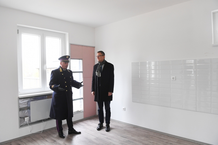 Rétvári Bence, a Belügyminisztérium parlamenti államtitkára, a KDNP politikusa és Farsang Tamás, a büntetés-végrehajtás országos parancsnokának gazdasági és informatikai helyettese látogatást tesz a büntetés-végrehajtás fogvatartottjai által épített energiatakarékos szolgálati lakóparkban a X. kerületben, a Budapesti Fegyház és Börtön közelében 2022. december 2-án. MTI/Illyés Tibor