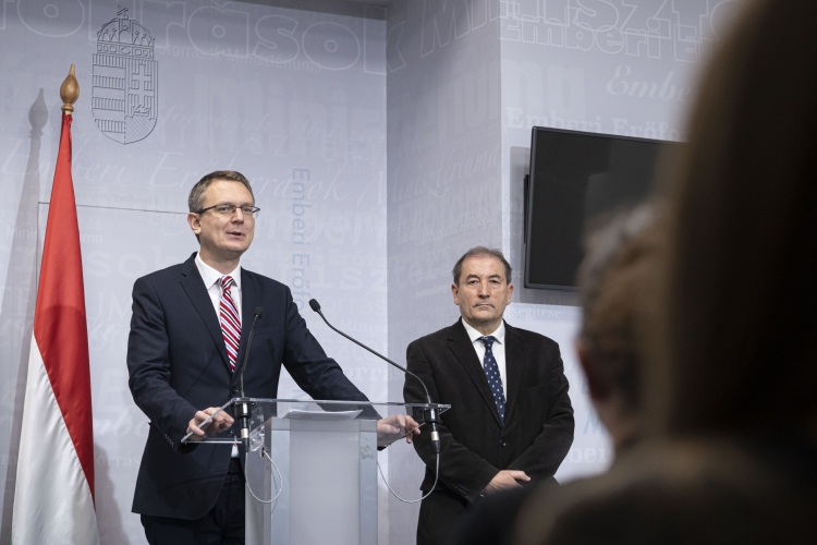 Rétvári Bence, az Emberi Erőforrások Minisztériumának parlamenti államtitkára, a KDNP alelnöke, országgyűlési képviselő (balra) és Brassói Sándor, az Oktatási Hivatal elnöke (jobbra) a Jeles napok portálról tartott sajtótájékoztatón (Fotó: MTI / Szigetváry Zsolt)