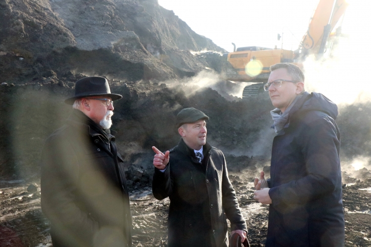 Riz Gábor, a magyarországi lignittermelés növeléséért, a villamos energia ellátásbiztonságáért és a lakossági fűtési célú energiaellátás biztonságáért felelős miniszteri biztos, a térség fideszes országgyűlési képviselője, Huszti Béla, az Ormosszén Zrt. vezérigazgatója és Rétvári Bence, a Belügyminisztérium parlamenti államtitkára a felsőnyárádi barnakőszénbányában tartott sajtóbejáráson 2023. február 7-én. Az Ormosszén bánya tulajdonjogát tavaly novemberben vette át az állam. MTI/Vajda János