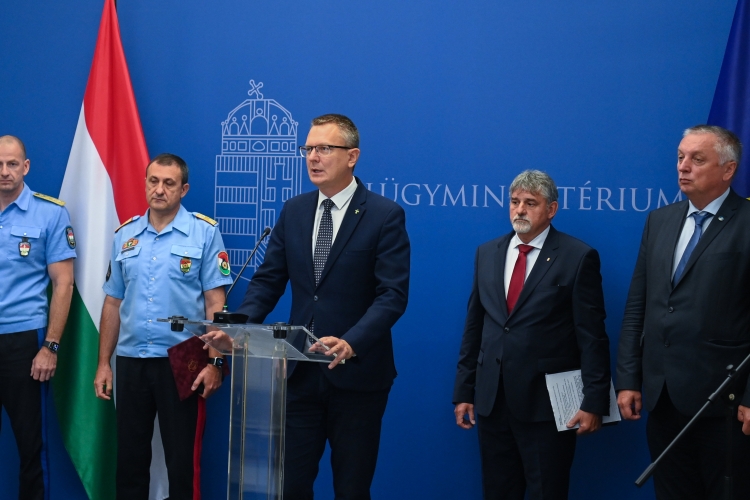 Rétvári Bence, a Belügyminisztérium parlamenti államtitkára (k) a viharkárok elleni védekezésről a minisztériumban tartott sajtótájékoztatón 2023. augusztus 8-án. Mellette György István, a Miniszterelnökség területi közigazgatásért felelős államtitkára (j2), Góra Zoltán, az Országos Katasztrófavédelmi Főigazgatóság vezetője (b2), Kuczik János rendészeti országos rendőrfőkapitány-helyettes (b) és Láng István, az Országos Vízügyi Főigazgatóság vezetője. MTI/Máthé Zoltán