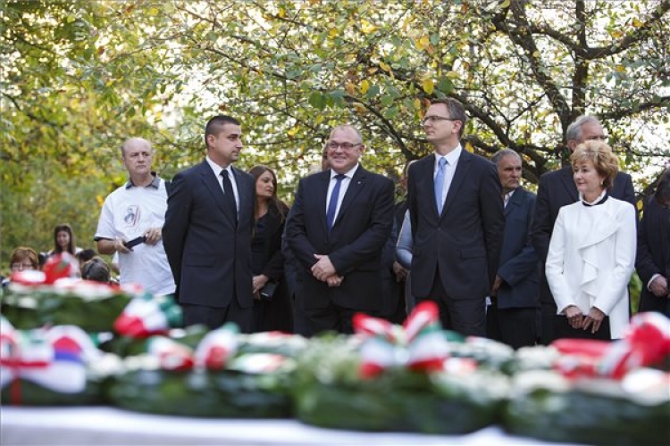 Söjtör, 2018. október 17. Könyves Gábor polgármester (b2), Pácsonyi Imre (Fidesz-KDNP), a Zala Megyei Közgyűlés alelnöke (b3), Rétvári Bence az Emberi Erőforrások Minisztériumának parlamenti államtitkára (j2) és Sifter Rózsa, Zala megyei kormánymegbízott a Deák Ferenc születésének 215. évfordulója alkalmából rendezett ünnepségen a Zala megyei Söjtörön 2018. október 17-én. (MTI fotó: Varga György)