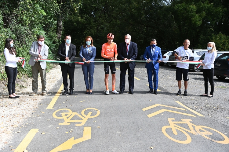 Nyul Zoltán, a Nemzeti Infrastruktúra Fejlesztő Zrt. beruházási vezérigazgató-helyettese, Schanda Tamás, az Innovációs és Technológiai Minisztérium (ITM) parlamenti és stratégiai államtitkára, Vitályos Eszter, az Emberi Erőforrások Minisztériumának európai uniós fejlesztéspolitikáért felelős államtitkára, Valter Attila, a Tour de Hongrie országúti kerékpáros körverseny győztese, Hadházy Sándor fideszes országgyűlési képviselő, Dobróka Tamás, a kivitelező HE-DO Kft. tulajdonosa és Révész Máriusz aktív Magyarországért felelős kormánybiztos (b-j) átvágja a nemzeti színű szalagot a Budapest és Szentendre közötti kerékpárút avatásán 2020. szeptember 18-án. (MTI fotó: Bruzák Noémi)