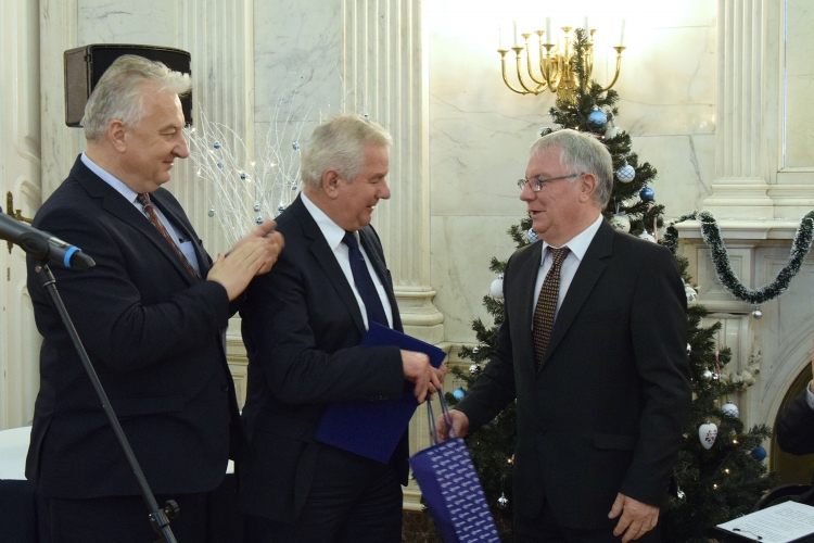Semjén Zsolt nemzetpolitikáért felelős miniszterelnök-helyettes (b), Kiss-Rigó László szeged-csanádi püspök (k) és Balogh László, a Közszolgálati Közalapítvány Kuratóriumának elnöke (j) a Magyar Rádió Márványtermében 2019. december 12-én. (KDNP fotó: Váli Miklós)