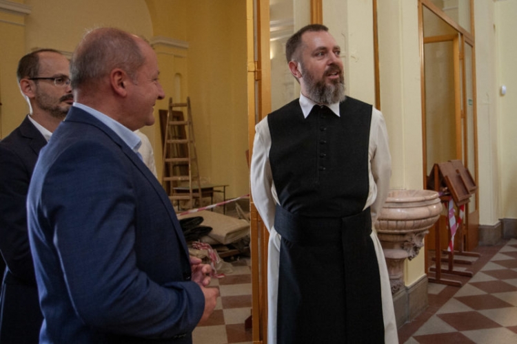Simicskó István, Újbuda országgyűlési képviselője, a KDNP frakcióvezetője és Szkaliczki Örs atya megtekintik a felújítási munkálatokat (Fotó: Lokál)