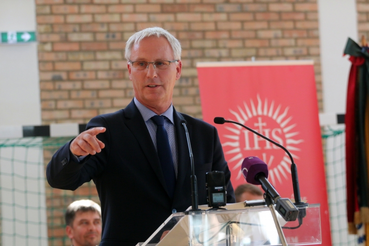 Soltész Miklós, a Miniszterelnökség egyházi és nemzetiségi kapcsolatokért felelős államtitkára beszédet mond a Fényi Gyula Jezsuita Gimnáziumhoz kapcsolódó Közös-Tér Központ átadási ünnepségén Miskolcon 2019. szeptember 13-án. Az avasi lakótelepen élőknek is nyitott, közösségi, kulturális feladatokat is ellátó tornacsarnok 1,45 milliárd forintból épült fel. (MTI fotó: Vajda János)