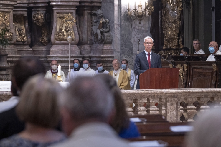 Soltész Miklós, a Miniszterelnökség egyházi és nemzetiségi kapcsolatokért felelős államtitkára köszöntőt mond a megújult fővárosi V. kerületi Egyetemi Kisboldogasszony-templomban 2020. szeptember 6-án. Több mint egymilliárd forint állami támogatásból újult meg a barokk épület, amelyet Erdő Péter bíboros, esztergom-budapesti érsek szentmise keretében áldott meg (b5). (MTI fotó: Szigetváry Zsolt)