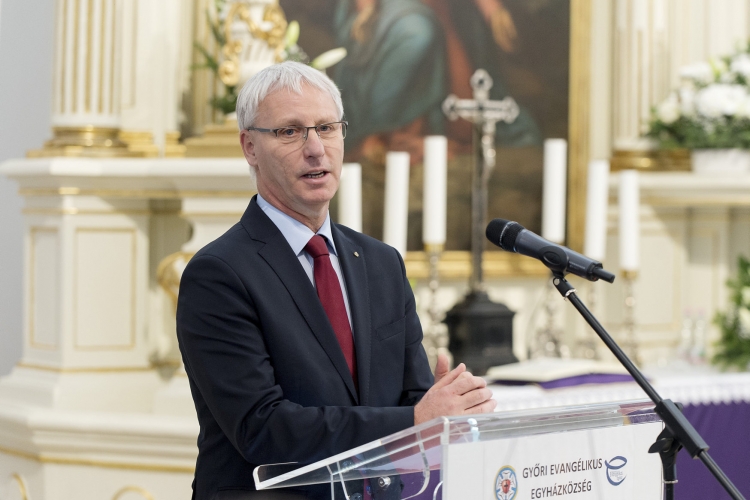 Soltész Miklós, a Miniszterelnökség egyházi és nemzetiségi kapcsolatokért felelős államtitkára beszédet mond a Győri Evangélikus Egyházközség lelki, oktatási és szociális intézményeit magába foglaló, teljes egészében megújult Insula Lutherana (Evangélikus Sziget) épületegyüttes átadóünnepségén Győrben, az evangélikus Öregtemplomban 2019. december 1-jén.(MTI fotó: Krizsán Csaba)