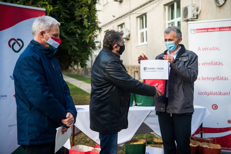Gere József lelkipásztor, a Joyce Meyer Ministries magyarországi képviselője (b2), Nagy Sándor, az Országos Vérellátó Szolgálat szakmai főigazgató-helyettese (j) és Soltész Miklós, a Miniszterelnökség egyházi és nemzetiségi kapcsolatokért felelős államtitkára, a Nemzeti Humanitárius Koordinációs Tanács (NHKT) elnöke a keresztény szervezet adományátadásán a szolgálat központjában 2021. január 12-én (Fotó: MTI / Balogh Zoltán)