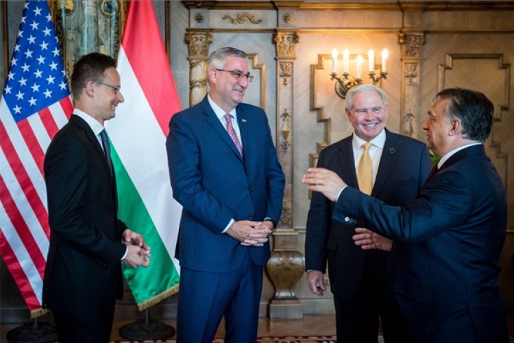 Miniszterelnöki Sajtóiroda által közzétett képen Orbán Viktor miniszterelnök (j) fogadja Eric Holcombot, az egyesült államokbeli Indiana kormányzóját (b2) a Parlamentben 2017. június 14-én. Mellettük Szijjártó Péter külgazdasági és külügyminiszter (b) és Jim Schellinger indianai kereskedelmi miniszter (j2). MTI Fotó: Miniszterelnöki Sajtóiroda / Botár Gergely