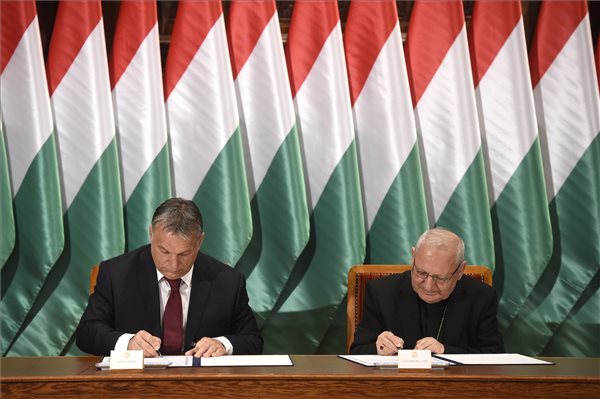 Orbán Viktor miniszterelnök (b) és Lui Rafael Szakó babiloni káld katolikus pátriárka aláírja az iraki Tell-Aszkuf megrongált lakóházainak helyreállításához nyújtott magyar kormányzati hozzájárulásról szóló egyezményt Országházban 2017. május 30-án. MTI Fotó: Bruzák Noémi
